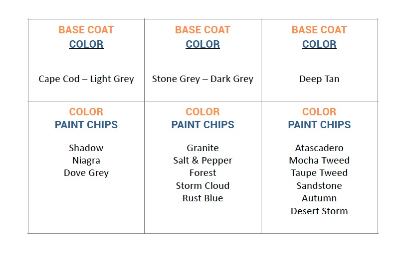 - Chip blends on the actual color chart represent chips only – the above pics represents our floors – we broadcast 70-80% chips on top of the basecoat – we do not do a 100% broadcast.